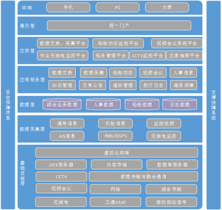无线电信号检测,船舶动态监控,船务管理(视频会议系统、IPTV、船机管理信息系统),船岸通讯,船舶局域以及相关项目的信息化系统集成。航标综合业务管理,同时具备海事巡视船舶的相关通讯指挥功能。 系统架构图如下: